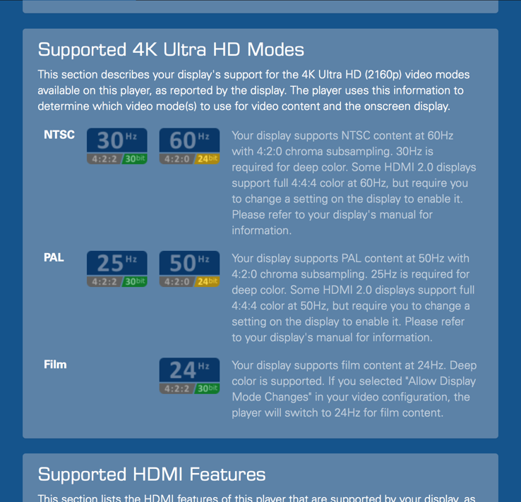 The Video Ports section at the top of this page shows a visual representation of the rear ports of the player. It will show when a video port is active or in standby. The state of the port is important as the reported capabilities of the port may be dependent on its current state. This is useful for knowing the state of the port when the video output may not be in direct line of sight, the display is set to the wrong input, or the display has gone into standby.