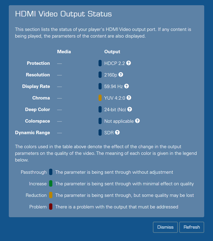 This section shows the output status of the HDMI port, as of when the window was opened or refreshed. It works when displaying the onscreen display, and while playing content, so you can use it to confirm that 4K Ultra HD content is being displayed at full resolution, that 1080p content is being up-scaled, and that the expected frame rates and color information are being output.