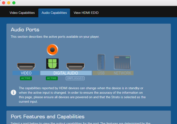 The Audio Ports section at the top of this page shows a visual representation of the rear ports of the player. It will show when an audio port is active, in standby, or unplugged. In the cases of the coax and optical ports, they will always show as active regardless of whether connected to anything or not. The state of the port is important as the reported capabilities of the port may be dependent on its current state.