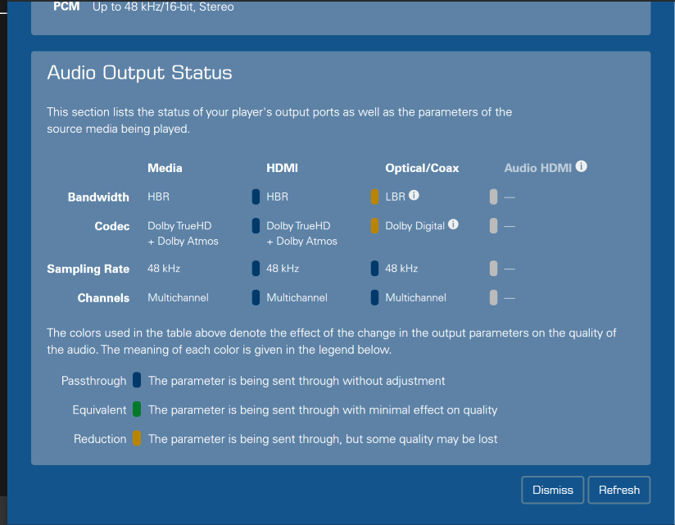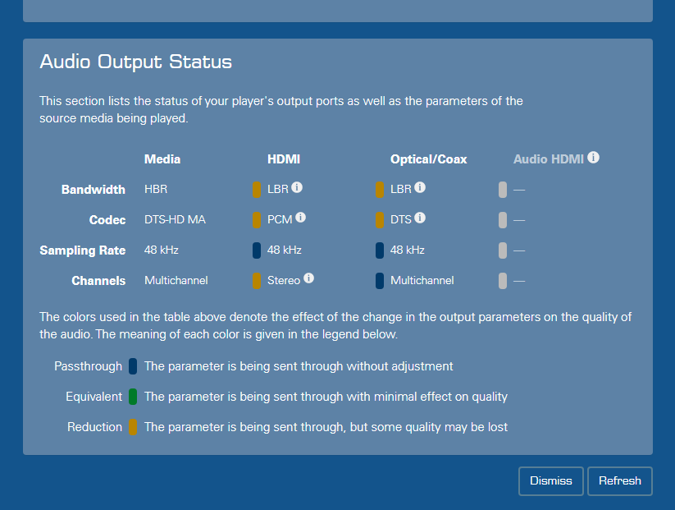 The Audio Output Status shows the original format of the playing media along with what is currently being output by each port. In the above example, the media is multichannel DTS-HD Master Audio but the player is directly connected to a display that is only capable of stereo PCM.